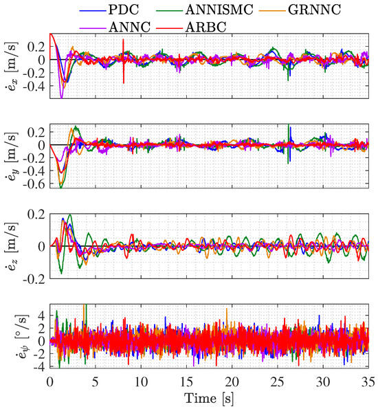 The obtained velocity errors are depicted in Figure 8. Notice that the closest to zero for the x, y coordinates and the yaw angle are the ones obtained with the ARBC.