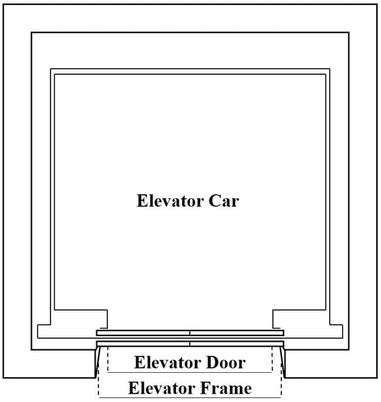 Since the elevator recognition is performed based on LiDAR sensors in this study, the structure of the elevator should be considered. The elevator structure consists of three main types: an elevator door for passengers to get on and off, a door frame surrounding the gate to the elevator, and a car that is a part of the elevator carrying the passengers or cargo, as shown in Figure 1 [19]. The elevator structure that can be measured by LiDAR when the door of the elevator is closed includes the elevator door and the door frame, and these two factors are used to set the recognition conditions for the elevator gate.