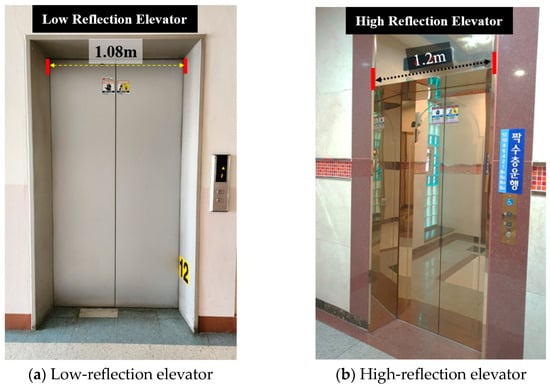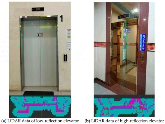 However, sensors that measure distances using light sources, such as LiDAR, show good performance with general materials with low reflectivity, but high-reflective materials with high reflectivity result in low recognition performance due to the diffused reflection of light. When scanning an elevator door finished with a low-reflective material with low surface reflectance, the shape of the elevator is clearly shown in the LiDAR raw data collected. For this reason, recognition techniques using the regularity of data are possible. However, in the case of elevators made of high-reflective materials with high surface reflectance, recognition techniques depending on regularity are impossible to use due to a high level of measurement errors in the collected data [18].