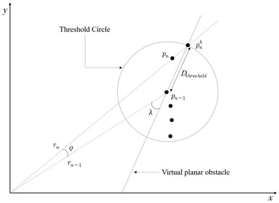 Therefore, this study applied the ABD (adaptive breakpoint detector) segmentation algorithm that adaptively responds to the threshold value, which sets the segmentation standard, as shown in Figure 3, according to the measurement distance of the LiDAR sensor. The radius of the threshold circle can be obtained through Equation (3) and is the noise of the sensor device according to the measured distance value. Based on this, if the distance value between the points and calculated through Equation (4) is greater than , it is separated into a new cluster. The condition for separating into new clusters is shown in Equation (5).