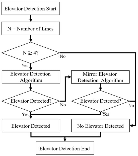 In order to recognize the elevator, detection conditions should be set according to the characteristics of the elevator structure. This study presents a recognition algorithm using the characteristics of line segments generated through the IEPF line segment extraction algorithm. The elevator recognition technique determines whether or not the recognition technique is implemented by comparing the number of lines generated through the IEPF with the minimum number of lines that can represent the shape of the elevator, as shown in Figure 5. The elevator recognition technique first performs low-reflective elevator recognition, and if it is not detected, high-reflective elevator recognition is performed to determine whether the elevator is detected.