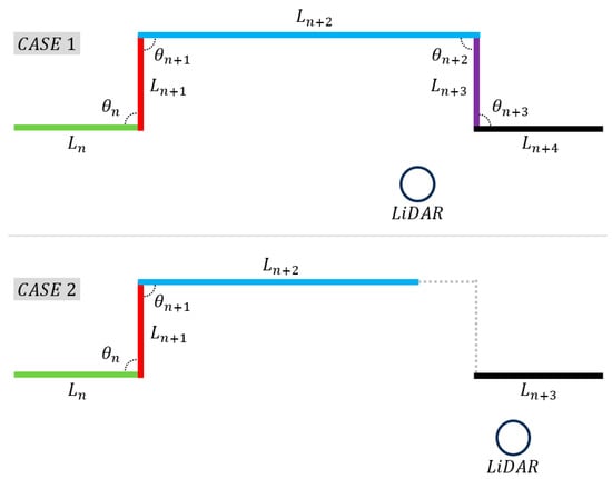 The point-cloud type containing elevator information is divided into two cases, depending on the location of the LiDAR sensor being scanned, as shown in Figure 6. CASE 1 of Figure 6 shows the case where the scan was performed at a position where the LiDAR sensor could detect the entire structure of the elevator, and CASE 2 shows the result of the scan at a position where the right side of the elevator was not detected. Therefore, in this study, the elevator feature detection conditions are examined based on the extracted line segments to recognize the two types of elevators determined by the location of the LiDAR sensor.