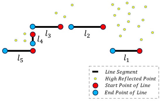 Therefore, in this study, the IEPF line segment extraction algorithm was used as a method to extract the line segment of clusters with elevator information. The line segment extraction process of the IEPF algorithm repeats the split-and-merge process compared to , a factor that determines the split process based on the point where the distance between , the starting point of each cluster, and the line L passing through , the ending point, and points existing in other clusters meet, as shown in Figure 4.