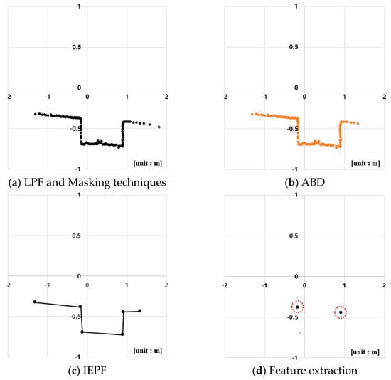 The experiment for elevator recognition with low-reflective materials was conducted in the order of LPF, masking technique, ABD, IEPF, and elevator feature detection algorithms based on the raw data scanned from LiDAR.