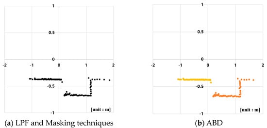 The threshold value of the masking technique applied in this paper is 2 m, and the distance error rate of the RPLiDAR-A2 used is less than 1% based on the measured distance, resulting in a maximum error rate of 0.02 m or less for the measured data. In addition, considering the minimum door width of 0.8 m for accessible elevators according to the Act on Ensuring Convenience for the Disabled, the Elderly, and Pregnant Women in Korea, and the maximum width of 0.7 m for indoor electric wheelchairs according to the ISO (International Organization for Standardization) standard 7176-5 (Determination of dimensions, mass and manoeuvring space), the results of this experiment confirm that there is no problem in applying the wheelchair active driving technique [28,31].