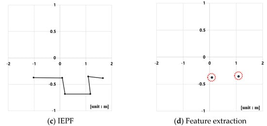 Figure 11 represents the results of the elevator recognition algorithm at the location of the LiDAR sensor where one elevator door frame cannot be detected. Figure 11a is a raw-data-based point-cloud with information from a general elevator. Based on this, it can be seen that a total of two clusters were created as a result of performing the ABD clustering algorithm, which is shown in Figure 11b. The results of performing the IEPF line segment extraction algorithm based on the generated clusters are shown in Figure 11c, and the results for the coordinates detected by performing the elevator recognition technique based on the generated line segments are shown in Figure 11d.