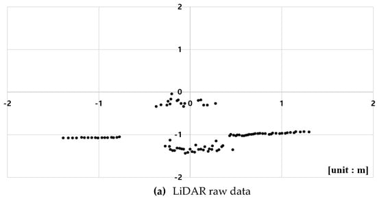 In the experiment for low-reflective elevator recognition, verification of the elevator gate recognition technique was conducted at a location where the entire elevator gate is detected through the LiDAR sensor and a location where one elevator door frame is not detected, as shown in Figure 9a and Figure 9b, respectively.
