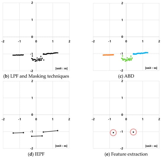 Figure 12a shows a raw-data-based point-cloud containing the elevator information for high-reflective materials. It can be seen that noise is generated due to the high surface reflectance of the high-reflective elevator materials. Figure 12b is the result of applying LPF and masking techniques from the results of Figure 12a, Figure 12c is the result of creating a total of three clusters through the ABD clustering algorithm, Figure 12d is the result of creating a total of three segments through the IEPF line segment extraction algorithm based on the generated clusters, and Figure 12e represents the elevator door frame coordinates detected through the elevator recognition technique of the high-reflective materials based on the generated line segments.