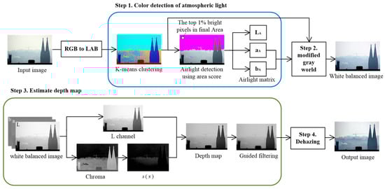 A flowchart of the proposed method is shown in Figure 2. As shown in Figure 2, the proposed dehazing method incorporates the following four stages: extraction of color components in airlight, improved hazy color correction based on the gray world hypothesis, depth map setting based on luminance and saturation, and dehazing. Since both color correction and dehazing in this study used the LAB color space, the RGB color space was first converted into the LAB color space to perform the color correction algorithm, and the color-corrected image was used as an input image for dehazing to estimate the depth map for the LAB color space. The estimated depth map restored the L channel through the ASM, and the restored L, a, and b channels were converted to the RGB color space for the final output.