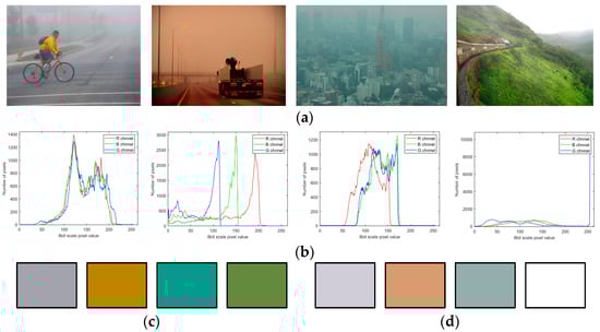 Veil color in various types of hazy images: (a) original images, (b) histogram of the original images, (c) average colors of the original images, and (d) airlight colors of the original images.