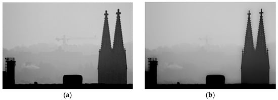 Equations (14) and (15) can effectively estimate the depth map using only a simple linear equation. However, because the same equation is applied to the entire region, the performance of restoring visibility for nearby objects’ shading or distant scene visibility is still unsatisfactory. Therefore, this study introduces weights reflecting saturation characteristics, as explained in Section 3.3.2.