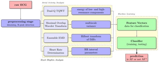 A block diagram of the proposed method is shown in Figure 1. It consists of five major stages: (i) the pre-processing stage, which includes denoising and R-peak detection; (ii) atrial activity analysis, which comprises three transformations of the atrial activity extracted from the ECG signal; (iii) heart rhythm analysis; (iv) the gathering of data for the feature vectors; and (v) the classification stage, which includes training (to create a classification model) and testing. The implemented feature estimation methods are all inherently finite or possess stopping criteria to avoid latency or runtime errors. With a data window width of 30 beats [8], the window is marked with a pre-trained classifier. On this basis, the beginning of an episode of atrial fibrillation can be detected with a latency of 30 heartbeats.