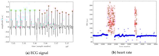 (a) ECG signal and fibrillation episode in 4048 signal (channel: 1) from MIT-BIH Atrial Fibrillation Database (green circles denote R-peaks with normal sinus rhythm, red stars denote R-peaks annotated as atrial fibrillation); (b) heart rate signal (bpm) with clinically recognized AF (blue circles denote normal sinus rhythm heart rate, whereas red circles denote heart rate corresponding to AF).