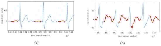 Examples of atrial activity (thick red line) without (a) and with (b) atrial fibrillation (signal 4048 from MITBIH AFDB).