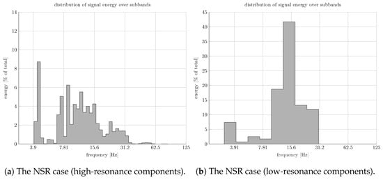 Having obtained the wavelet coefficients with the DQ-TQWT, the wavelet entropy is also calculated as the maximum entropy value in individual sub-bands for the high- and low-resonance components of the transformation. WT-based entropy measures the degree of both order and disorder in a signal, as well as the underlying dynamic process associated with it. The Matlab procedure wentropy (Shannon entropy) is applied, and the corresponding factors are indicated as and , respectively, for high- and low-resonance decomposition coefficients after the DQ-TQWT. The energy distribution within the sub-bands for high- and low-resonance components is presented in Figure 4.