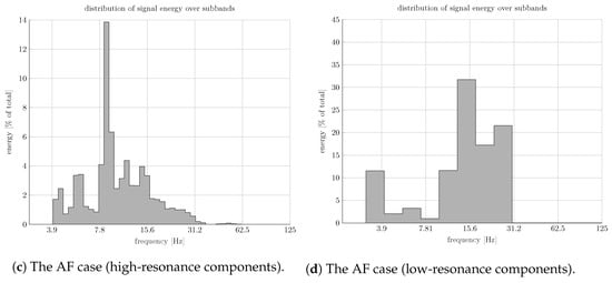Different energy distributions within sub-bands in wavelet coefficient domain for normal sinus rhythm (NSR) (a,b) and for atrial fibrillation (c,d).
