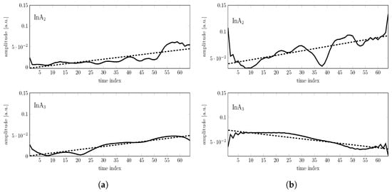 It should be mentioned that in EEMD, each is decomposed independently of the different noise realizations, and for each of them, a residual is obtained at each stage. Having obtained the intrinsic mode function components from the EEMD, the Hilbert transform is applied to each IMF component [59]. This transform allows one to obtain one of the instantaneous amplitudes (InAs—the absolute values of the analytic signals) [8]. Taking into account the ith IMF and applying the Hilbert transform, the respective analytic signal, , is calculated as