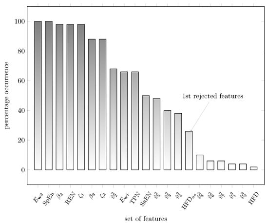 where denotes the predicted value of the classifier for the selected set of features, and is the known test value. For the feature selection process, we were provided with a dataset that contained 80% of all features. This resulted in a dataset of 30,085 vectors for a given number of total cases . Of these, 75% (22,564 feature vectors) were used in the operation of the genetic algorithm. The remaining 25% (7521 vectors) were used to determine the accuracy rate (Acc) of the prediction. The manipulations performed prevented the chosen features from being over-matched to the examined database. The feature selection results are shown in Figure 6. It is evident that features , SpEn, InA, Ren, and were the most commonly seen in the set of features that guaranteed the highest value of the classification accuracy factor. On the other hand, it is possible to identify features that appeared less often in the feature sets allowing for high accuracy values to be achieved. These features were HFD and HFD, as well as for . The selected features were very similar to those selected when the reference methods were used, i.e., ReliefF [68,69] and MRMR [68,70]. A comparison of the chosen set of features is displayed in Table 4.