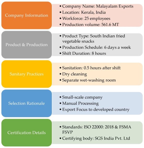 The company selected for this study was a small-sized company [34], Malayalam Exports. The company employed 25 workers and was located in Kerala State in India. The company manufactured a variety of South Indian fried vegetable snack products. Production was carried out six days a week and consisted of one eight-hour production shift, followed by half an hour for sanitation. The company was selected because of its small size and its production of traditional fried vegetable snacks using manual processing. A sanitary facility program was in place, with dry-cleaning procedures enforced in most production areas of the facility to minimise the establishment of environmental pathogens. A separate wet-washing room was used for washing, drying, and sanitising small equipment. The reason for the selection of this company for this study was because the enterprise was an exporting company, intending to expand exports to developed countries. The selected company achieved two certifications: ISO 22000:2018 and the Foreign Supplier Verification Program (FSVP) certification to fulfil their importing countries’ standard requirements. Both certifications were conducted by third-party audits (SGS India Pvt. Ltd., Gurugram, India) (Figure 1). Prior to the implementation, no staff members had received specialised instruction in the fundamentals of food safety. The factory hired and trained an expert for this job in order to prepare for the implementation. The hiring and training of such a worker was one of the crucial responsibilities involved in the implementation process.