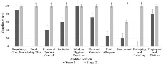 Percentage of compliance with requirements, in particular the food safety sections before and after certification (Stage 1 and 2, respectively). * reflects the significant improvement.