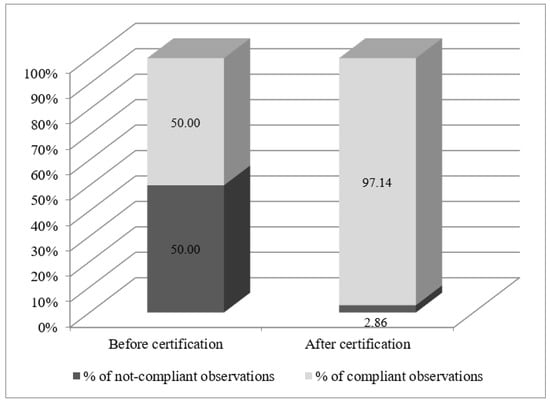 Cochran’s Q test showed that the overall level of compliance before certification was 50%, and after certification—97.14% (Figure 4). The p < 0.0001 was lower than α, which indicated that the certification had a positive and significant impact on the level of compliance.