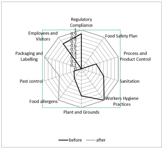 The differences in compliance with the food safety section are presented in Figure 5. The largest differences resulting from certification were observed in the food safety plan and packaging and labelling sections, where none of the parameterisation conditions were met before certification but all improved afterwards. In second place was the food allergens section, where there was an improvement from 0.3 to 1. There was also a large improvement in the process and product control section, where the post-certification score improved from 0.4 to 1. No differences were observed in the workers’ hygiene practices section, and slight differences were observed in the regulatory compliance section, where there was only a 0.1 improvement, and in the employees and visitors section, where there was a 0.2 improvement.