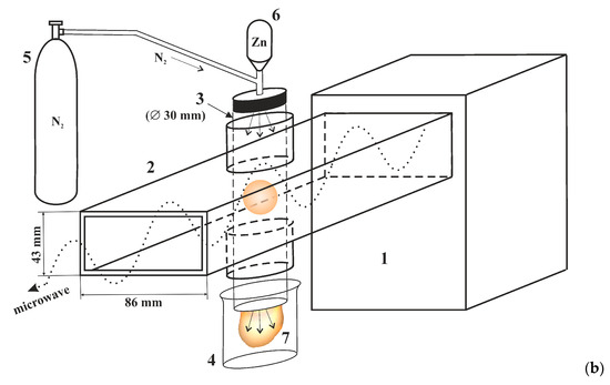 For the experiment, zinc powders (99.98% purity) 30–40 μm mean particle size provided by OCHV, Russia, were utilized. The waveguide microwave atmospheric-pressure plasmatron was utilized for ZnO plasma synthesis (Figure 1).