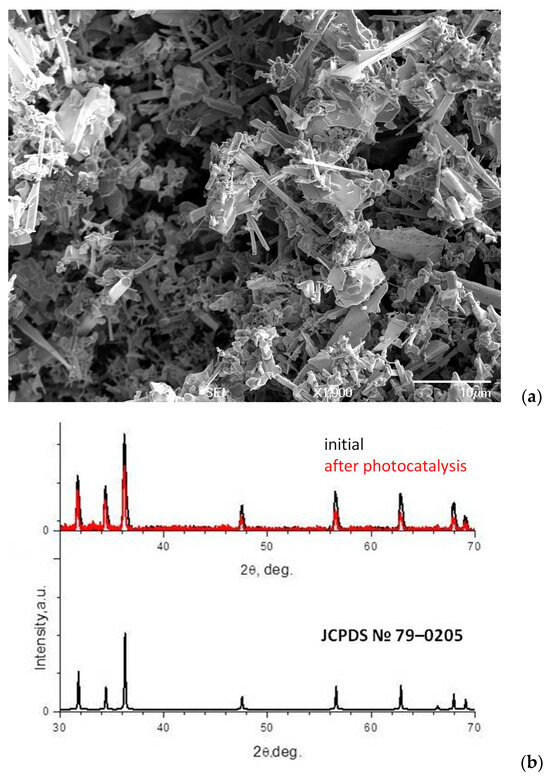 There may be several reasons for the high photoactivity of ZnO microstructures. First of all, it may be due to a structural factor. It was found [36] that nanorods have the greatest photocatalytic activity and this is associated with a high proportion of (100) texture. According to [37,38], in the plane (100) is the lowest energy of formation of defects, in particular, oxygen vacancies. According to XRD (Figure 2b), the ratio is I100/I001~1.27. Taking into account the large number of rod-like (001) structures of ZnO (Figure 2a), the value of the ratio 1.27 indicates the presence of a high fraction of (100) texture in the ZnO powder.