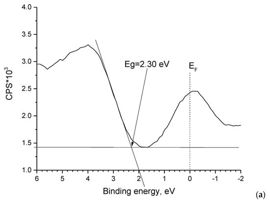 For microscopic studies, the JCM-6000 (JEOL, Tokyo, Japan) desktop scanning electron microscope (SEM) equipped with an energy dispersive X-ray (EDX) microanalyzer was utilized. X-ray studies were carried out on an X’PERTPRO diffractometer (PANalytical, Almelo, The Netherlands) in the Bragg–Brentano “reflection” geometry using CuKα radiation (λ = 1.54 Å) with a Ni β-filter. Previously, the powder was thoroughly rubbed. X-ray photoelectron spectroscopy (XPS) utilizing the Specs spectrometer (Specs, Berlin, Germany) equipped with Al and Mg anodes was utilized to determine the chemical composition of the surface layer and to measure the valence band of the samples. The spectrometer is metrologically verified. In this work, we utilized Al anode excitation. The anode material was chosen in such a way that the useful signal did not overlap with the Auger lines. The spectra were recorded in the binding energy range from 0 to 1200 eV. The binding energies were calibrated over the C-C line of the C1s spectrum (Eq = 284.6 eV). The etching was conducted with argon ions with energy of 4 keV for 2 min. To determine the band gap by UV/VIS spectroscopy, a spectrometric complex based on the MDR-41 monochromator (NPO Spektr, Novocherkassk, Russia) was utilized. The material powder was poured onto a special holder and compacted thoroughly. Diffuse reflectance spectra were taken in the wavelength range of 200 to 500 nm.