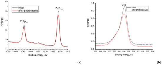 Analysis of features in the XPS spectra before and after photocatalysis also demonstrates the presence of the same components: 530.1 eV (the peak is characteristic of O2− ions of the surface lattice oxygen in ZnO matrix), 531.3 eV (attributed to oxygen defects in the matrix of metal oxides, related to oxygen vaccines), and 532.6 eV (the band is related to the surface hydroxyl (Zn–OH) group).