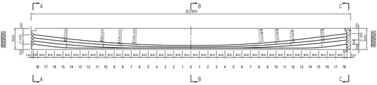 Layout of prestressed reinforcement of simply supported T-beam bridge with 30-m span (unit: mm).