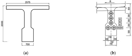 In this paper, the bridge structure adopts a BEAM4 unit, which is a common type of unit for main beam modeling. It is a 3D elastic beam unit with 6 degrees of freedom directions (UX, UY, UZ, ROTX, ROTY, ROTZ), which can withstand axial tension, pressure, bending moment, and torsion, and does not have the function of plasticity and eccentric force. Here, the mid-span section of a 30-m span simply supported T-beam is taken as an example. The section size and structure are shown in Figure 2, Figure 3, Figure 4 and Figure 5, using the International System of Units, and the specific values are shown in Table 1.