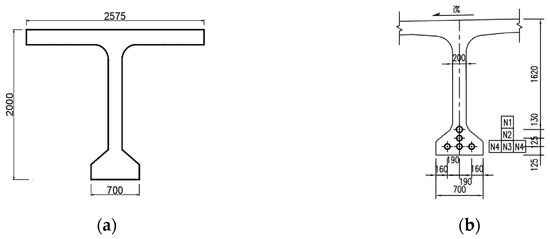 Schematic diagram of a midspan section of a 30-m span simply supported T-beam bridge (unit: mm). (a) B-B cross-section diagram. (b) B-B section steel bundle layout diagram.