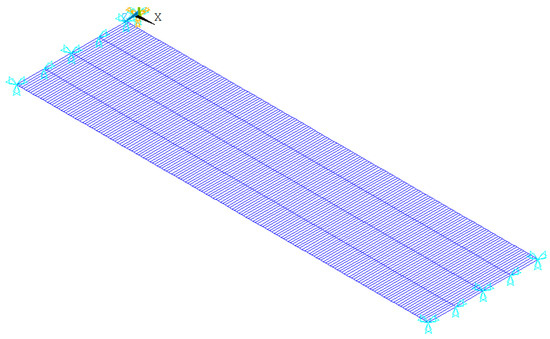 For the finite element simulation, ANSYS was used to establish the finite element model of the bridge, and a BEAM4 element was used to simulate the main beam, a MASS21 element was used to simulate the mass, as well a COMBIN14 spring element. The finite element model of the bridge with a 30-m span simply supported T-beam is shown in Figure 6.