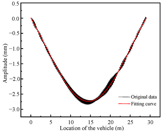 The reliability of the measured actual structural deformation condition of the bridge can be inferred from the consistent frequency data gathered by the sensors of the health monitoring system. The utilization of high-frequency sampling allows for the collection of accurate deformation data related to bridge constructions. Nevertheless, it is crucial to acknowledge that this methodology is accompanied by significant financial considerations and a surge in the amount of data being processed. If the approach of acquiring low-frequency and equal-frequency data is employed, it will result in the loss of crucial information and a significant discrepancy between the monitoring outcomes and the actual data [42]. Simultaneously, the quasi-static response predominantly manifests in the low frequency range of the overall dynamic response. In this part, the shortened time-domain signal will be fitted using the quasi-static deflection time-history curve of the bridge. The highest frequency of the quasi-static deflection response is , the mean value is , the mean square deviation is , and the variance is . Then, the relative errors of the digital characteristics of the structural response time-history curve and the quasi-static response time-history curve obtained through reasonable acquisition frequency are as follows:
