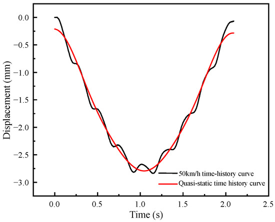 Take the 30-m simply supported T-beam as an example. See Figure 1 and Figure 2 for the section size and superstructure. The vehicle load travels at a uniform speed of 50 km/h, and the midspan time-history curve of the structure is obtained. At the same time, the quasi-static time-history curve of the structure is obtained by driving at a uniform speed of 1 km/h with the same vehicle load, as shown in Figure 8.