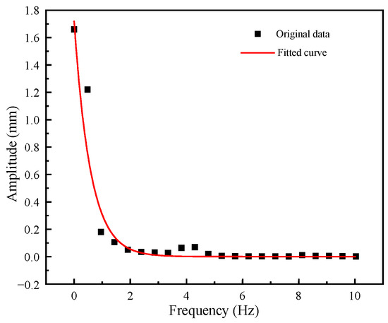 The finite element program is midspan to simulate the probability density function of the amplitude spectrum frequency curve. In conjunction with the original data distribution, it is evident that the distribution pattern of the amplitude of the midspan deflection signal at a given frequency bears resemblance to that of an exponential distribution. The probability density function of the exponential distribution is represented by Formula (7), and the corresponding fitting outcome is depicted in Figure 9.