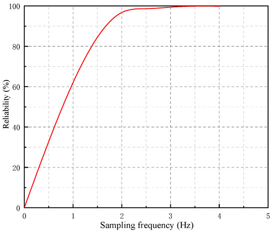 Because the acquisition frequency is twice the cutoff frequency, i.e., , when the bridge span is 30 m, the vehicle load is about 333 kN, and the vehicle speed is 50 km/h, the reliability calculation of the acquisition frequency of the structure is shown in Formula (17):