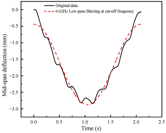 Based on the obtained midspan deflection time-history curve, the re-collected data with different cutoff frequencies are obtained by low-pass filtering, and then the frequency-domain signal is converted into the time-domain signal by inverse Fourier transform, and the results are obtained, as shown in Figure 9.