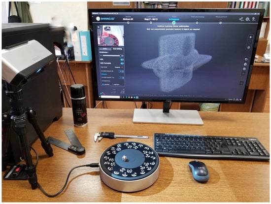 Following the application of the thin matte coating to the rotor, it was subjected to 3D scanning using the “EinScan-SP V2” scanner, manufactured by SHINING 3D, headquartered in Hangzhou, China, as depicted in