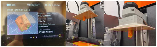 Figure 13) for a minimum of 6 min, in at least two different positions. In the same figure, one can notice that the support structure for the part has not yet been removed. The removal of the support structure will be carried out once the part reaches its final mechanical strength. Removing the support structure before the final curing can lead to non-uniform release of internal stresses within the material, potentially causing deformation in the rotor at the end of the curing process.