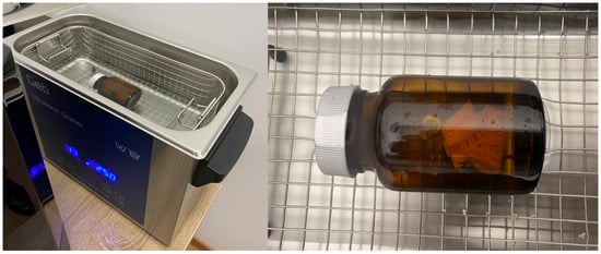 Figure 12). To prevent contamination of the ultrasonic bath with resin, it was filled with water, and the rotor was placed in a glass container filled with isopropyl alcohol. After cleaning the rotor, it was removed from the isopropyl alcohol container, and the dissolved resin in the container was cured using ultraviolet radiation. Finally, with the aid of a sieve, the cured resin in the container was separated from the isopropyl alcohol, which can be reused for the same process numerous times.