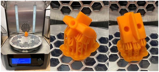 The machine code generated by the slicer is fed into the 3D printer, the “Prusa SL1S.” The printer incrementally solidifies successive layers, each with a thickness of 50 µm, using ultraviolet (UV) radiation, which is selectively blocked by a liquid crystal display (LCD) screen. After approximately 40 min, the result is a semi-solidified rotor, as shown in