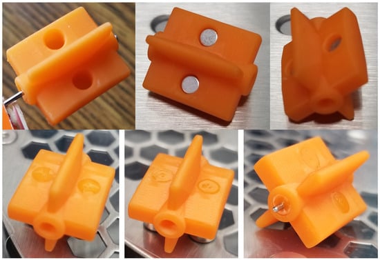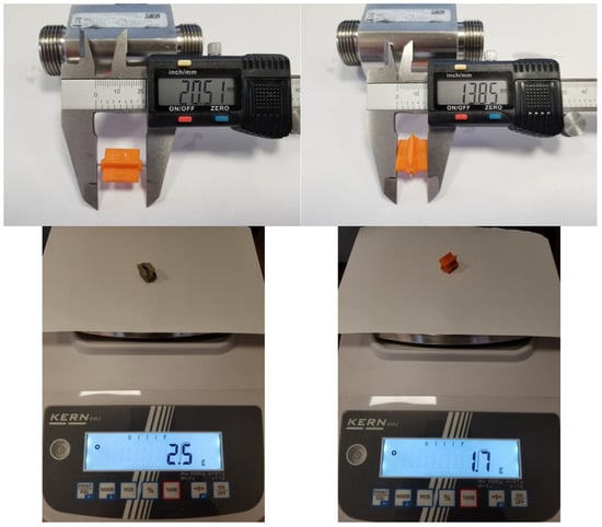 A notable difference can be observed between the original flowmeter rotor (the damaged one) and the one produced using additive manufacturing, particularly regarding the size of the magnets. In the original rotor, the magnets were cylindrical in shape with a diameter and length of 5 mm each, whereas in the new rotor, they are also cylindrical but with a diameter of 3 mm and a length of 3 mm. To ensure a similar signal amplitude for the “Hall” sensor within the flowmeter, and considering that the new magnets are stronger and placed one millimeter farther from the sensor, the magnetic field strength of the original magnets was compared with that of the new magnets using the deformation of an elastic spring. It was found that the elastic spring exhibited a slightly greater elongation when subjected to the new magnets’ magnetic field.
