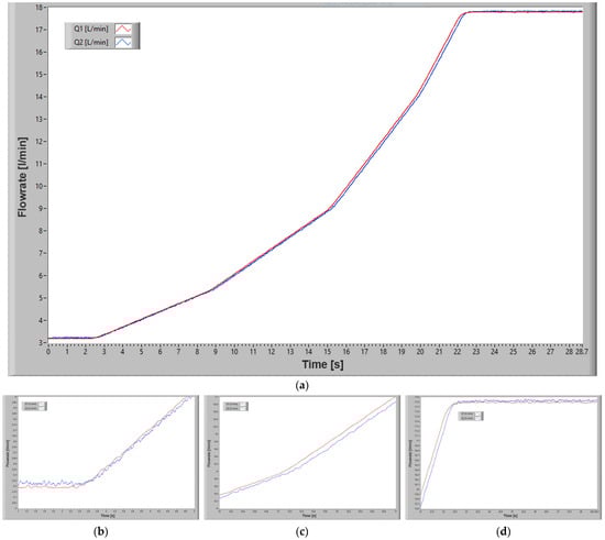 Figure 18 presents the time variation of the flowrates for the two flowmeters (a) and details of this variation for three distinct periods: the beginning of the measurements (b), the end of the measurements (d), and the middle of the measurements (c). The red curve (Q1) represents the flowrate of the reference flowmeter, while the blue one (Q2) represents the flowrate of the remanufactured flowmeter. In the same figure, one can notice that, when changing the flowrate value, there is a small lag (delay) between the two flowrates, which is caused by the moment of inertia of the remanufactured flowmeter’s rotor. Additionally, on the linear portions of the curve, the flowrate value of the remanufactured flowmeter is slightly higher, by approximately 0.05 L/min, compared to the reference flowmeter’s value. This offset should be electronically applied in the data acquisition software afterward to ensure both flowmeters display identical values (calibration purposes).