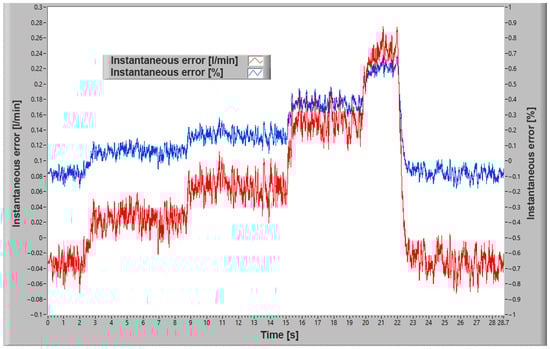 Figure 20), there is a deviation of +0.28 and −0.08 L/min (absolute 0.36 L/min), with the absolute percentage error being less than 1% (+0.7% and −0.2%). These deviations primarily arise due to the lag between the two measurements.