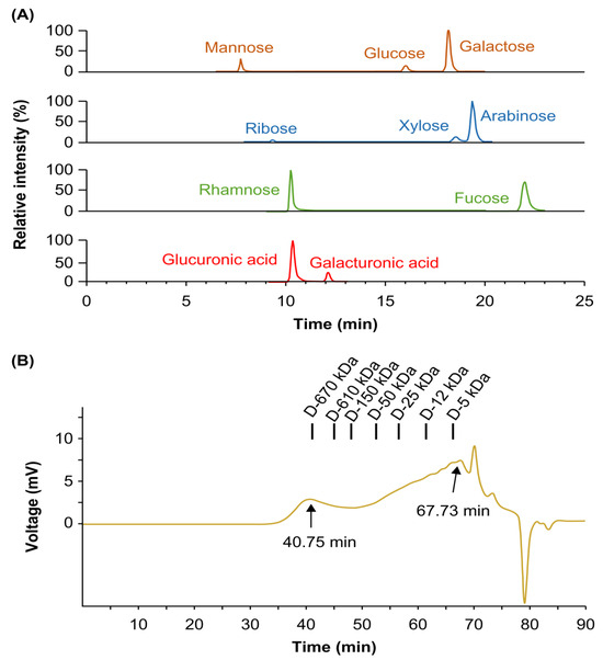 Chemical characterization of polysaccharides derived from Drynaria fortunei (DFPs). (A) Extracted ion chromatograms of monosaccharides in DFPs using ultrahigh-performance liquid chromatography–tandem mass spectrometry. (B) Chromatogram of DFPs obtained using high-performance size-exclusion chromatography with refractive index detection.