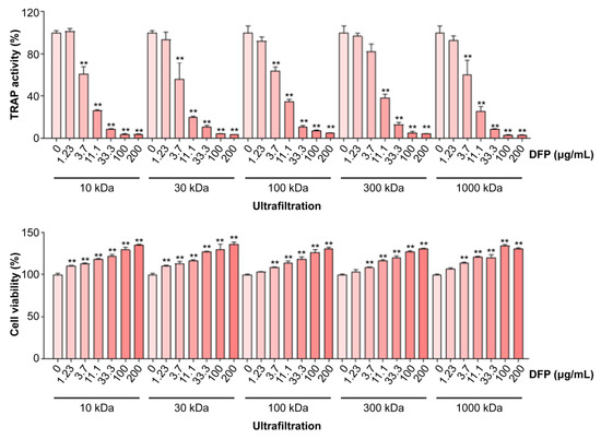 Inhibitory effects of DFPs subjected to ultrafiltration (10–1000 kDa) on osteoclast differentiation of receptor activator of nuclear factor-κB ligand (RANKL)-stimulated BMDMs and cell viability. The effects of 0–200 µg/mL DFPs were analyzed by measuring the TRAP activity in RANKL-induced BMDMs. Data are presented as mean ± SEM. ** p < 0.01 compared to the control (one-way ANOVA).