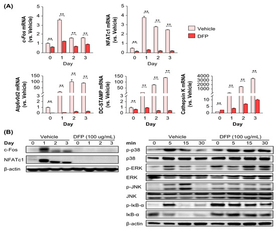 Molecular mechanism underlying DFP modulation of osteoclast differentiation of bone-marrow-derived macrophages. (A) Inhibitory effects of DFPs on the mRNA levels of key transcription factors and osteoclast-specific genes involved in cell fusion and maturation. (B) Inhibitory effects of DFPs on c-Fos and nuclear factor of activated T cells 1 (NFATc1) protein levels. β-Actin was used as the control. Data are presented as mean ± SEM. ** p < 0.01 compared to the control (two-way ANOVA with Bonferroni test).