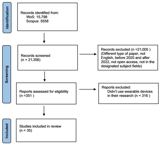 In order to narrow down the selection, specific inclusion criteria were applied. The criteria included open access articles written in English, published within the last three years (2020–2022), and falling within subject categories related to Sport Sciences (in WoS CC) and Health Professions and Medicine (in Scopus), which encompass areas such as Sports Therapy and Rehabilitation and Orthopedics and Sports Medicine. Open-access articles are included to ensure accessibility and transparency in the research. Articles in English are selected for consistency and to facilitate a wider readership. Annual scope was chosen to follow the growth of use and influence of social distance measures during the pandemic years (research conducted before and during pandemic). Studies falling within categories related to Sport Sciences (WoS CC) and Health Professions and Medicine (Scopus) are included because they are more likely to contain research on wearable technology within the context of sports, physical activity, and health. Studies were considered if they made clear the sort of monitoring tool used and the physical activity (PA) component being measured, especially if they mentioned it in the methodology. Additionally, studies that focused on activities of daily living (ADL), which involve people engaging in a variety of activities as opposed to being inactive, were included. This information is essential for a comprehensive analysis of the effectiveness and applicability of wearable technology.